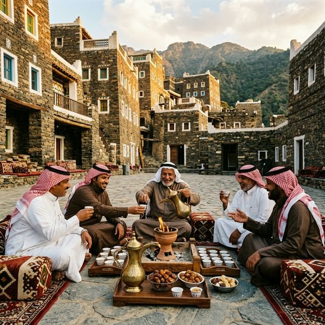 قصة مجالس القهوة التراثية في رجال ألمع ودورها في تعزيز الترابط الاجتماعي ونقل الحكايات والقيم بين الأجيال.